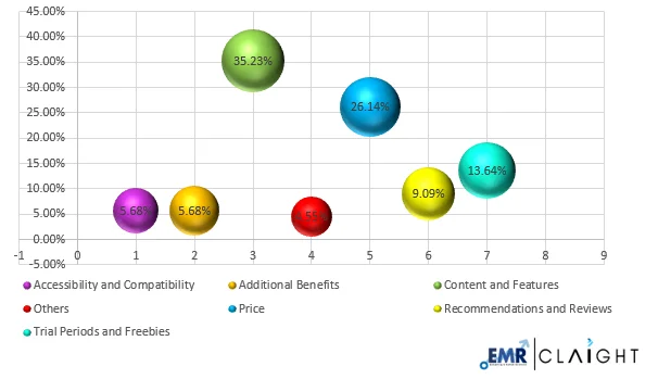 Over 35% subscribe based on the feature and content presented by the platform which is a positive sign for the industry as it shows a healthy and organic subscriber base who value content and services provided over all other factors. While 26% subscribe for the price point whereas only 13% subscribe for freebies and trial periods showing that subscribers prefer a low cost or a value for money product instead of the freebies and trial period businesses provide. Recommendation and reviews, Accessibility and compatibility also attract only 5.68% each showing trends which are further explained in a study provided by Expert Market Research, the study also points out how these numbers can be increased.