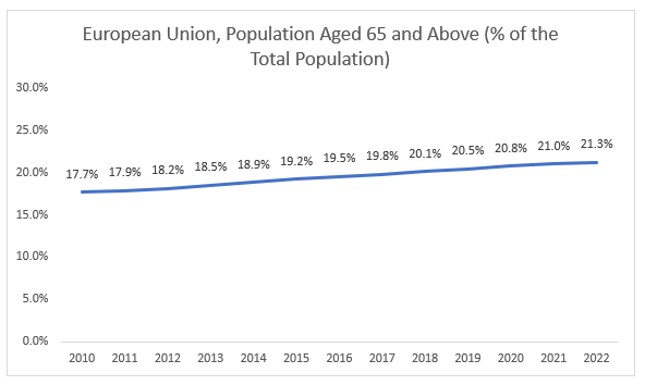 The Europe dietary supplements market benefits from the region’s ageing population which adds to the demand for health and wellness products, including dietary supplements, to support healthy liefestyle. Over one-fifth of the total European population is 65 or above. According to the World Bank, in 2022, 21.3% of the total population belonged to the age bracket of 65 and above in the European Union, which was only 17.7% in 2010. Further, according to Eurostat, the EU-27's elderly population (65+) is projected to grow significantly, from 90.5 million in 2019 to 129.8 million by 2050. The number of people aged 75-84 will increase by 56.1%, and those aged 65-74 will rise by 16.6%. This changing age demographic is expected to notably aid the Europe dietary supplements market.