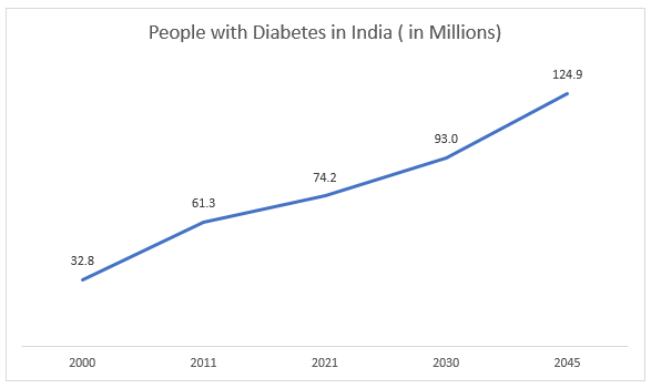 Individuals are being driven to act quickly to manage or cure diabetes due to increased understanding of the disease's symptoms and side effects. Nowadays, people know that early detection of diabetes and appropriate treatment methods can greatly postpone the development and progression of its consequences. About 25 million people in India are prediabetics, or at a higher risk of acquiring diabetes in the near future, and an estimated 77 million adults over the age of 18 have type 2 diabetes. Furthermore, the widespread accessibility of blood glucose monitors for monitoring blood sugar levels along with the rising incidence of obesity among working-age individuals is boosting the India diabetes market expansion.