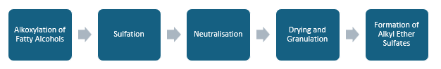 The manufacturing of alkyl ether sulfates begins with the alkoxylation of fatty alcohols. In this step, the fatty alcohols, which typically have carbon chain lengths ranging from C12 to C15 or C12 to C14, are reacted with ethylene oxide and/or propylene oxide. The next step is the sulfation of the alkoxylated alcohols, which is achieved by reacting the alkoxylated alcohols with sulfur trioxide gas in a tubular thin film reactor. The sulfation process introduces a sulfate group onto the end of the polyalkylene oxide chain, forming the alkyl ether sulfate molecule. After sulfation, the alkyl ether sulfate product is neutralised with a base, usually sodium hydroxide, in the presence of a co-solvent like polyhydric alcohols, alkylene glycol mono-ethers, or polyalkylene glycols.