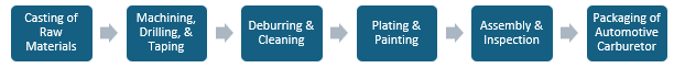 The production process of automotive carburetors begins with sourcing of raw materials such as aluminum and brass and their casting for forming the carburetor body. This is followed by machining, where precision tools shape the components to exact specifications. Next, drilling and tapping are performed to create necessary holes for assembly. Afterward, parts undergo deburring and cleaning to remove any sharp edges and contaminants. The components are then subjected to plating and painting for corrosion resistance and aesthetic appeal. Following this, the carburetor is assembled, integrating various parts like the float chamber and venturi. The carburetors are then tested, packaged, and prepared for shipping to automotive manufacturers.