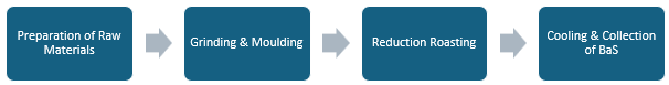 1. Preparation of Raw Materials: The barium sulfate ore (barite) is crushed and ground to a fine powder. The carbon source (coke or charcoal) is also ground to a similar fine consistency.