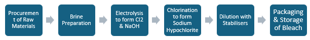 The production of bleach, primarily sodium hypochlorite, begins with the preparation of raw materials, including sodium hydroxide (NaOH), chlorine (Cl2), and water (H2O). First, sodium chloride (NaCl) is dissolved in water to create a brine solution, which is then purified. The next step involves the electrolysis of the brine, generating chlorine gas and sodium hydroxide. Following this, chlorine gas is reacted with sodium hydroxide in a chlorination process, producing sodium hypochlorite through the reaction: 2NaOH + Cl2 → NaOCl + NaCl + H2O. After the formation of sodium hypochlorite, the solution is diluted to the desired concentration, typically around 5-6% for household bleach, and stabilisers, such as sodium hydroxide or sodium silicate, are added to prevent decomposition. Finally, the bleach is packaged into containers, such as bottles or jugs, and stored in a cool, dark place to maintain its efficacy and prolong shelf life.