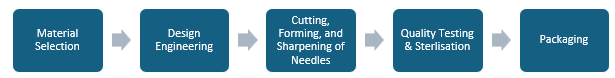 The production process of a bone marrow biopsy needle begins with material selection, where high-quality stainless steel is chosen for its durability and biocompatibility. Next, design engineering is conducted to develop the specifications for the needle, including gauge size and tip type, such as diamond or aspiration tips. The manufacturing process includes cutting the stainless steel to the required lengths, shaping the needle using precision machinery, and sharpening the tips for effective penetration. Next, quality control inspections are performed, and needles then undergo sterilisation using methods like ethylene oxide gas to eliminate any contaminants. Finally, the product is packaged and distributed to medical facilities or suppliers.