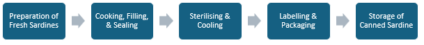 The process begins with the receiving and inspection of fresh sardines, which are then washed to remove any impurities and contaminants. The heads and tails of the sardines are trimmed off during the cleaning stage. Next, the sardines undergo pre-cooking or blanching and cooked sardines are then carefully placed into cans, often with added ingredients like oil or sauce. The cans are then sealed to ensure they are airtight. To eliminate bacteria, the sealed cans undergo sterilisation through high-temperature processing. Next, the cans are cooled down and labelled with product information. The labelled cans are then packaged for distribution.
