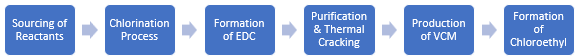 Once formed, the crude EDC is purified through distillation to remove impurities and by-products. The purified EDC is then subjected to thermal cracking at temperatures around 500 °C (932 °F), which breaks down EDC into Vinyl Chloride Monomer (VCM, C2H3Cl). This VCM is further purified to ensure it meets quality specifications for downstream applications. The final product consists of various chloroethyl compounds, which can include chloroethyl derivatives used in pharmaceuticals and chemical synthesis. Throughout this process, careful quality control of temperature, pressure, and reactant ratios is implemented.