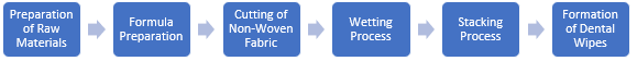 In the wetting process, these fabric sheets are saturated with the prepared solution. After wetting, the sheets are stacked and cut into individual pieces in the stacking and cutting stage. The next step is packaging, where the wipes are sealed in airtight containers or pouches, and labels are applied. Quality control measures are then implemented. Finally, the finished dental wipes are palletised for storage and distribution.