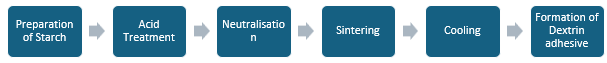The production of dextrin adhesive begins with the preparation of starch, which serves as the primary raw material. Starch derived from various sources such as corn, tapioca, or potato is charged into a processor unit, where it undergoes a drying process using hot air to achieve the desired moisture level. The dried starch is then subjected to an acid treatment, during which anhydrous hydrochloric acid (HCl) gas is injected onto the starch. The starch is reacted with HCl at a predetermined temperature for a set time, allowing for the controlled hydrolysis of starch molecules.