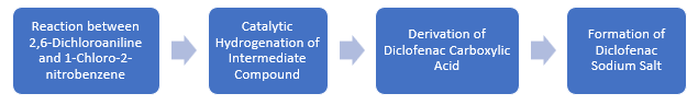 The production process of diclofenac is a multi-step process that results in the formation of diclofenac sodium salt. Firstly, a reaction occurs between 2,6-Dichloroaniline and 1-chloro-2-nitrobenzene in the presence of copper as a catalyst. In the next step, catalytic hydrogenation takes place for the conversion of the nitro group to the amine group. The carboxylic acid derivative of diclofenac is first formed which is then neutralised to obtain diclofenac sodium salt. The diclofenac can be then extracted and purified for industrial purposes.