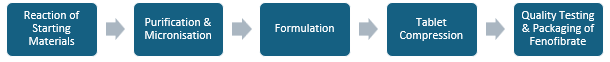 The production process of fenofibrate begins with the reaction of starting materials, such as clofibrate derivatives, under controlled conditions. Next, the compound undergoes purification to achieve a high-purity product and micronisation, which reduces the particle size to enhance bioavailability. Later, fenofibrate is formulated by mixing it with excipients, such as hydrophilic polymers and surfactants. This mixture is then compressed into tablets, and if necessary, coated to improve stability. Finally, the finished product is tested and packaged for distribution.