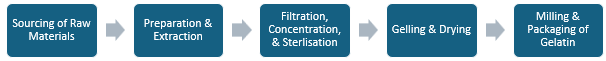 The production of gelatin begins with the selection of raw materials, typically collagen-rich sources such as animal hides, bones, or connective tissues. The process starts with the preparation of these materials, which includes cleaning and cutting them into smaller pieces. Next, the collagen is extracted by soaking the materials in acid or alkaline solutions, breaking down the collagen structure. The resulting liquid is then filtered to remove impurities. Next, the liquid undergoes concentration through the evaporation of water and is then sterilised by heating to eliminate any bacteria. Then the solution is cooled to form gelatin gels, which is later dried to remove moisture, resulting in dry gelatin. Finally, it is milled into powder, granules, or sheets, and packaged for distribution.