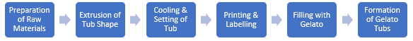 The production process for gelato tubs begins with gathering necessary raw materials, typically including thermoplastic polymers such as polypropylene or coated cardboard. These materials are mixed and then extruded into the desired tub shape using moulds. After shaping, the tubs are cooled to solidify, typically at temperatures around 20°C to 25°C. Next, the product undergoes quality control checks. Once approved, the tubs are filled with gelato flavours, printed with branding, and labelled. Finally, the gelato tubs are packaged for distribution.