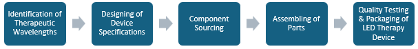 The production and manufacturing process of LED therapy devices for stretch marks begins with research and development, where manufacturers identify the therapeutic wavelengths most effective for skin treatment. Next, device specifications are designed, including size, power output, and user interface features. Then next step is component sourcing, which involves procuring high-quality LEDs, which are essential for the device's light therapy function. Manufacturers also acquire housing materials, typically plastic or metal, and gather necessary electronic components such as circuit boards and power supplies. With all components in hand, the assembly phase begins. After assembly, rigorous testing is performed to validate the functionality of the devices and later, they are packaged for distribution.