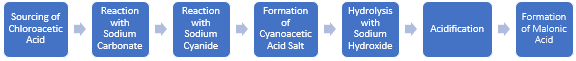 The production of malonic acid starts with chloroacetic acid (C2H3ClO2) and sodium cyanide (NaCN) as primary raw materials. These reagents react to form cyanoacetic acid, an intermediate product that is subsequently hydrolysed to yield malonic acid.