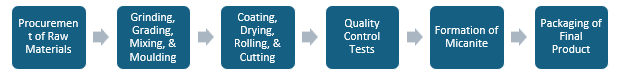 The first step in production process is the extraction of raw mica crystals from igneous rock formations through deep shaft or open pit mining. These extracted mica crystals are then sorted, graded, cut, and split. Next, the raw mica is ground down into fine particles using a hammer mill, which are then carefully graded. These are then mixed with water, and a colloid substance may be added to prevent settling. The mica mixture is then applied to a mesh mould, where its viscosity allows it to form into even sheets and these sheets are then coated and dried to remove excess moisture. The dried sheets are then rolled and cut to the required size and undergo rigorous testing before distribution. The final product, micanite, is a composite sheet material made up of fine mica lamellae bonded together by various bonding agents such as shellac, epoxy, alkyd, or silicone.
