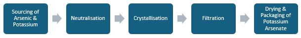 The production process of potassium arsenate begins with sourcing arsenic, typically in the form of arsenic trioxide (As2O3) or arsenic acid (H3AsO4), and potassium, which is usually obtained from potassium hydroxide (KOH) or potassium carbonate (K2CO3). The next step is the reaction phase, where arsenic acid is mixed with potassium hydroxide to form potassium arsenate. Next, the solution undergoes cooling and excess water is evaporated to concentrate the solution, leading to the formation of potassium arsenate crystals. Once crystallisation is complete, the mixture is filtered , dried to remove moisture, and packaged for distribution.
