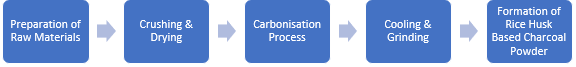 The production process of rice husk-based charcoal powder begins with the collection of raw materials, where dry rice husks are gathered, ensuring they have a moisture content below 10%. Next, the husks undergo crushing, where they are reduced to smaller pieces (around 5mm). Following this, the crushed rice husks are subjected to drying to further reduce moisture content to about 10%. Later the dried husks are heated in a carbonisation furnace at temperatures ranging from 400°C to 600°C in an oxygen-limited environment, converting them into charcoal. Next, the material is allowed to cool down before handling. Once cooled, the charcoal is then ground into a fine powder to produce rice husk charcoal powder. Finally, the finished product is packaged for distribution and use.