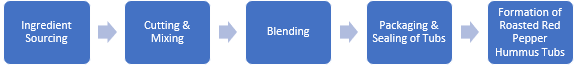 The production process of roasted red pepper hummus begins with ingredient sourcing, where high-quality chickpeas, roasted red peppers, tahini, olive oil, lemon juice, garlic, and spices are obtained from trusted suppliers. Next, the chickpeas are drained and rinsed, while fresh red peppers are roasted until charred, or jarred peppers are used. After preparation, the ingredients are mixed or blended until smooth and creamy. Following blending, the mixture undergoes quality control to check for texture and flavour; adjustments to seasoning may be made at this stage. Once approved, the hummus is transferred into packaging, where it is sealed in tubs and labelled for identification.