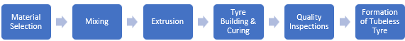 The production process of tubeless tyres begins with material selection, where various types of rubber, including natural and butyl rubber, along with carbon black, oils, and additives, are chosen for their specific properties. Next, in the mixing phase, these materials are combined in a Banbury mixer to create a homogeneous rubber compound. The process continues with extrusion, where the rubber is shaped into sheets or profiles for the sidewalls, treads, and inner liners.