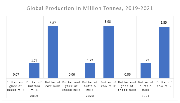 According to the FAO statistics, the production data from 2019 to 2021 reveals stable trends in butter production. Butter and ghee from sheep milk showed a minor decrease, from 0.07 million tonnes in 2019 to 0.06 million tonnes in 2020 and 2021. Buffalo milk butter production fluctuated slightly, with a decrease from 1.74 million tonnes in 2019 to 1.73 million tonnes in 2020, then a rise to 1.75 million tonnes in 2021. Cow milk butter, the highest production category, increased from 5.87 million tonnes in 2019 to 5.93 million tonnes in 2020 but fell to 5.80 million tonnes in 2021.