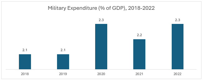 Drones, due to their improved precision and surveillance capabilities, are widely used for military and defence applications. According to the Stockholm International Peace Research Institute (SIPRI), military expenditure as a percentage of GDP from 2018 to 2022 has witnessed an increase. The military spending remained steady at 2.1% of GDP in 2018 and 2019. In 2020, there was an increase to 2.3%, likely reflecting heightened global tensions or increased defence needs. In 2021, spending slightly decreased to 2.2% but rose again to 2.3% in 2022. The trend indicates a general increase in military expenditure over the five years, suggesting that countries are prioritizing defence spending amid growing security concerns.