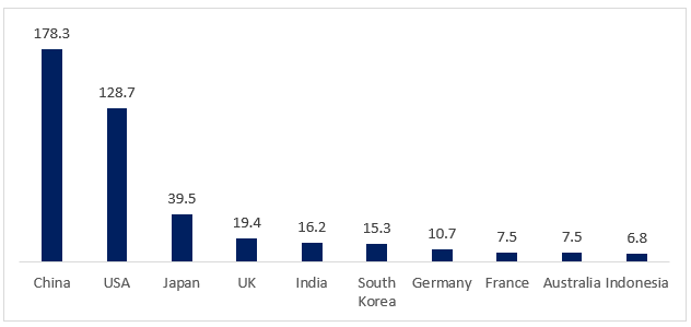 Top 10 Countries with Largest Revenue from Food and Beverages Sector, USD Billion, 2022