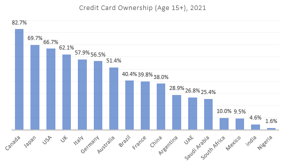 Table: Country wise Representation of Credit Card Ownership (age 15+) w.r.t. % of Population, 2021
