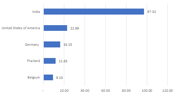 The global sugar production reached 175.3 million tons during FY 2022/23, according to USDA. The total exports reached USD 224.28 million in 2022. The top leading exporters of refined cane or beet sugar are India, the United States, and Germany, among others. The following chart shows the top 5 exporters of refined cane or beet sugar.