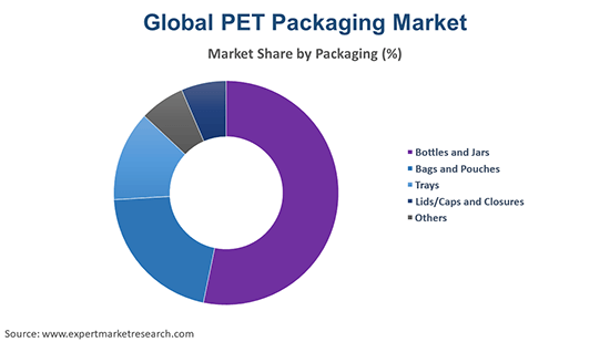 The significant packaging segments of PET packaging considered in the market report are bottles and jars, bags and pouches, trays, and lids/caps and closures, among others.