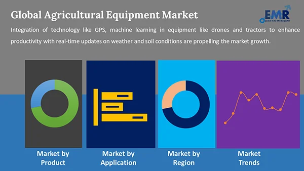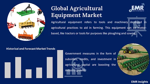 The global market for agricultural equipment is being driven by the surging demand for food crops due to the increasing population levels. Increasing demand for agricultural crops is a significant factor contributing to the demand for agricultural equipment useful for planting and irrigation, thereby boosting the agricultural equipment industry. Manual agriculture is being increasingly replaced by mechanisation in agricultural equipment, such as harvesters and tractors, to reduce costs and human efforts, and to produce higher crop yields in minimum time, thus augmenting the market growth. This equipment helps in the uniform distribution of nutrients and protectants that help in boosting agricultural production. Furthermore, to address the issue of global food security, governments around the world are introducing policies encouraging the growth of the agricultural sector. Government measures in the form of subsidies, investment in agricultural equipment, and government-backed loans for agricultural capital investments, among others, are encouraging farmers to adopt the latest agricultural practices. In addition, the strategies employed by the key players to expand their company in the agricultural equipment industry are further propelling the market for agricultural equipment.