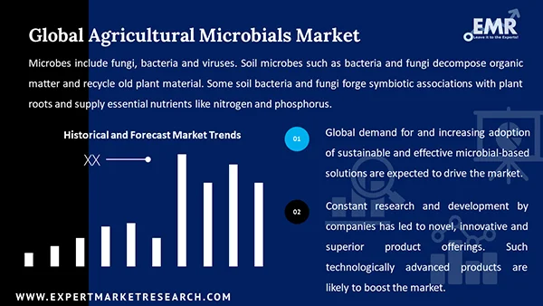 Increasing interest in sustainable farming, technological advancements, adoption of biofertilizers and biopesticides, and regulatory support and initiatives are the major trends impacting the global agricultural microbials market growth.