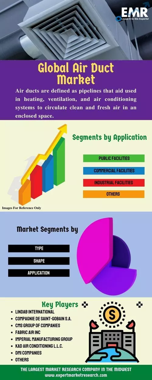The global market is expected to be driven by growth in commercial and public construction in the coming years. Large spaces, such as offices, hospitals, banquets, gyms, and large conference halls are equipped with air ducts to regulate ventilation and proper air conditioning across the room. In line with this, the growth in the number of commercial infrastructures on account of industrialisation is boosting the overall air duct market growth. Moreover, air ducts are also commonly found at airports, railway stations, and metro stations to circulate clean air in crowded spaces to avoid suffocation. Large-scale expenditure on urbanisation in major developing countries across the world and the development of public transportation are also expected to fuel the market growth in public facilities.