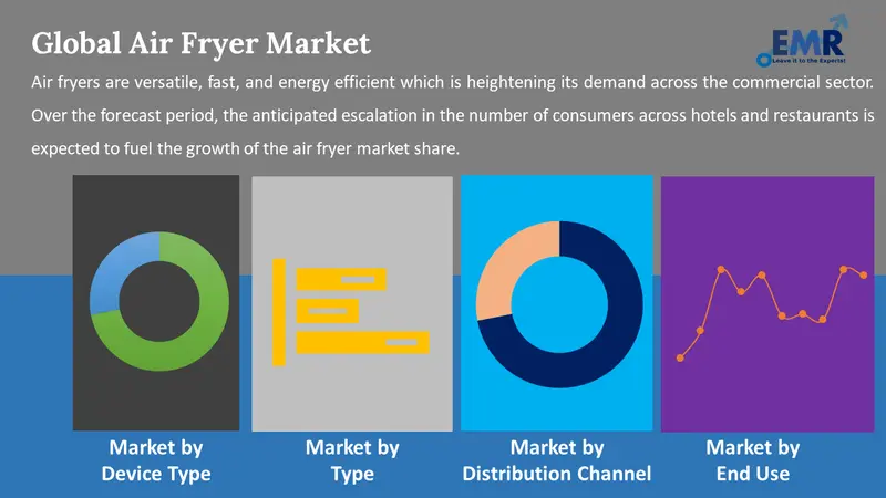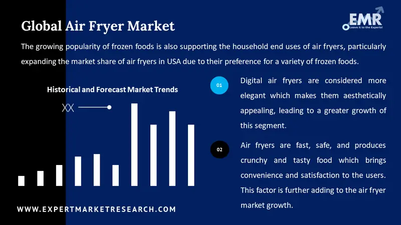 The air fryer market expansion is being driven by rapid innovations in cooking technologies, the launch of new kitchen appliances, and innovations in appliance manufacturing processes. With rising disposable incomes, changes in lifestyle, and the emergence of healthy food alternatives, people are switching towards cooking meals at home, which is expected to drive the market for air fryers forward in the coming years.