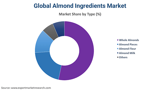 The leading types of almond ingredients in the market are whole almonds, almond pieces, almond flour, and almond milk, among others.