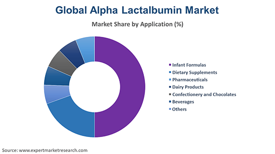 Alpha lactalbumin is widely utilised in the preparation of infant formulas, which is the leading application of the product. The presence of superior nutrients in alpha lactalbumin, which closely resembles breast milk nutrients, is driving the product demand in the food and beverage industry to prepare these formulations. Meanwhile, alpha lactalbumin is also finding applications in the pharmaceutical industry to produce anti-inflammatory drugs. Thus, the expanding applications of alpha lactalbumin in the food and beverage and pharmaceutical industries is expected to drive the growth of the market in the forecast period.