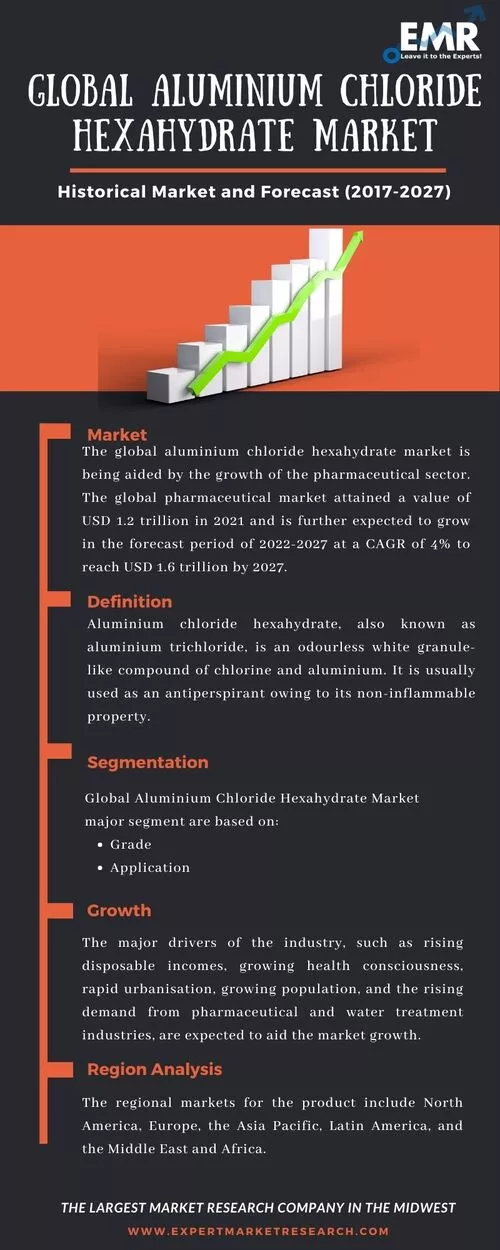 The global aluminium chloride hexahydrate industry is being driven by the rising demand from the pharmaceutical industry. It is commonly used as an antiperspirant. Aluminium chloride hexahydrate is also employed as a coagulant in sanitary and industrial water treatment owing to its high efficiency. This has increased the product demand in the wastewater treatment industry. Aluminium chloride hexahydrate is also used as a catalyst in the synthesis of aluminium metal. The growing cosmetic industry is also expected to augment the product's market growth. The adoption of aluminium chloride hexahydrate in grooming products such as lotions and creams is further boosting the market growth. These factors are expected to drive the aluminium chloride hexahydrate industry during the forecast period.