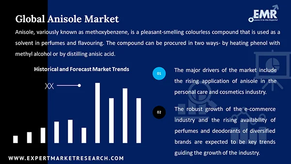 The rising applications of anisole in perfumes and deodorants are driving the market growth. With the growing disposable incomes, rising standards of living, growing inclination of millennials towards luxury brands and products, and aggressive promotion and branding strategies adopted by the major personal care companies, the consumption of perfumes and deodorants is considerably increasing. This, in turn, is bolstering the market for anisole. Moreover, the increasing demand for anisole to enhance the flavour of food in the food and beverage industry is estimated to propel the market growth in the forecast period. Additionally, the thriving pharmaceutical industry across emerging economies owing to the global increase in chronic diseases is anticipated to provide further impetus to the anisole industry in upcoming years.