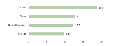 In 2021, the US mainly exported AEC services to Canada or the UK, with USD 1.25 billion exported to the UK and USD 1.22 billion to Canada.