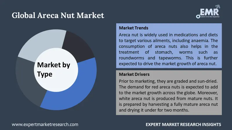 Prior to marketing, they are graded and sun-dried. The demand for red areca nuts is expected to add to the market growth across the globe. Moreover, white areca nut is produced from mature nuts. It is prepared by harvesting a fully mature areca nut and drying it under for two months.