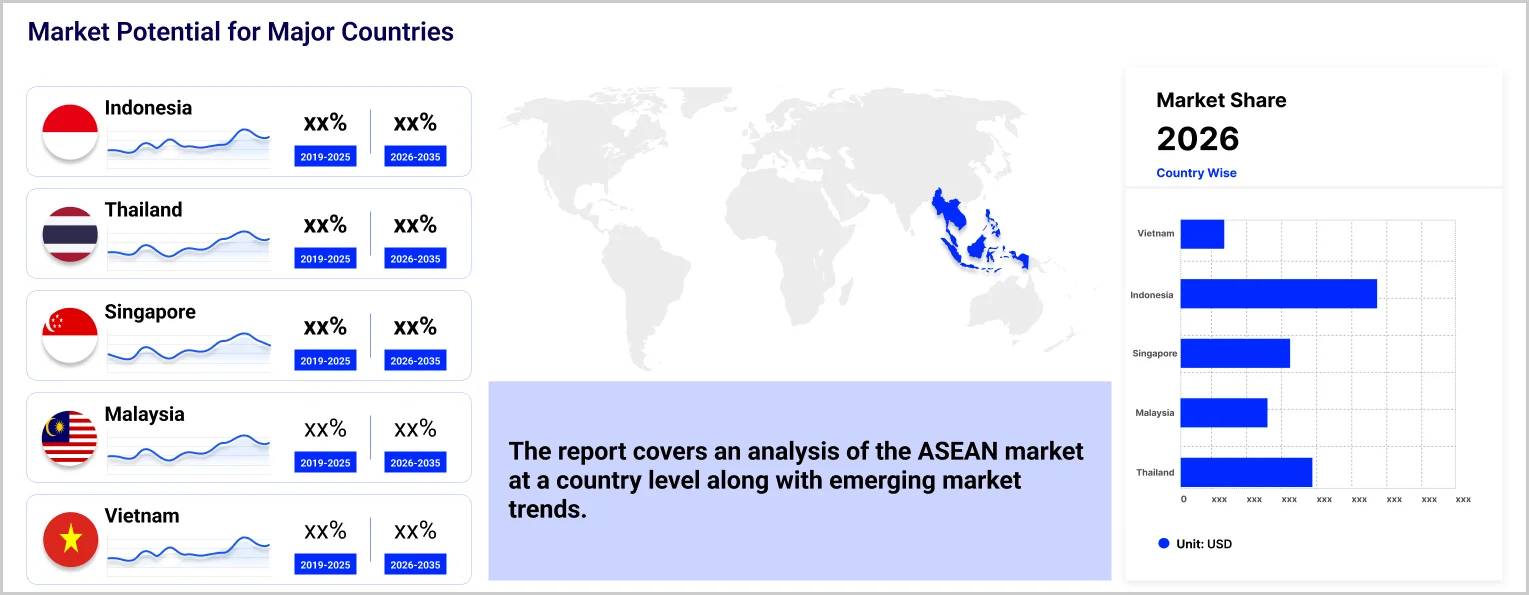 The major countries of trade finance considered in the ASEAN market report are Singapore, Thailand, Malaysia, the Philippines, Indonesia, and Vietnam, among others.