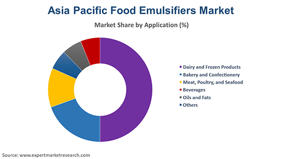 The significant application segments of food emulsifiers in the market in the Asia Pacific are dairy and frozen products, bakery and confectionery, meat, poultry and seafood, beverages, and oils and fats, among others.