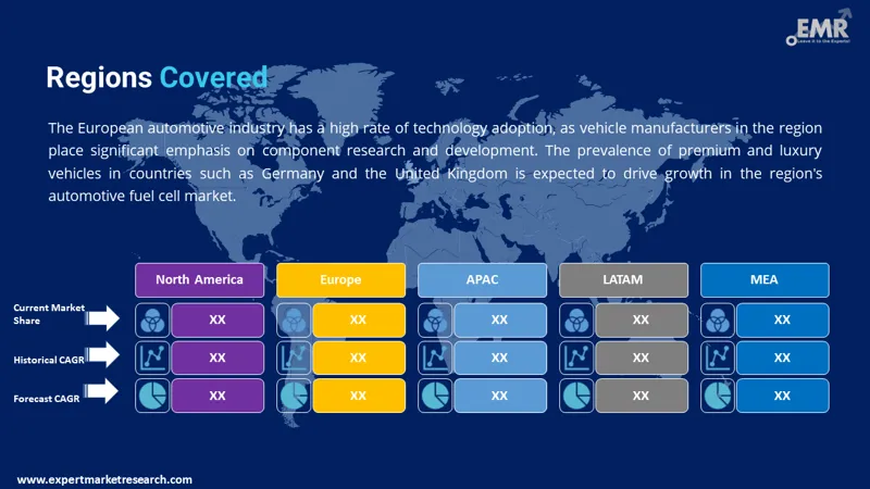 The regional markets for automotive fuel cells are North America, Europe, the Asia Pacific, Latin America, and the Middle East and Africa.