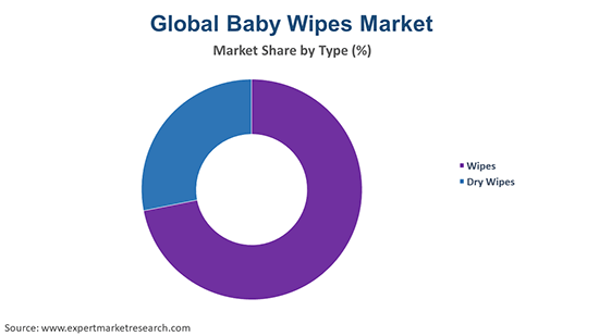 As per the baby wipes market analysis, dry wipes are highly versatile, making them suitable for cleaning hands, faces, and surfaces. Their lack of moisture gives them a longer shelf life and reduces the risk of bacterial growth. Manufacturers can customise them with various solutions, and their lightweight design enhances portability. Many options are eco-friendly, appealing to environmentally conscious consumers. In September 2024, GreenBaby launched a new line of hypoallergenic dry wipes, specially formulated for sensitive skin. Made from natural fibres, these wipes provide gentle cleaning and are free from harsh chemicals, ensuring safety for babies.