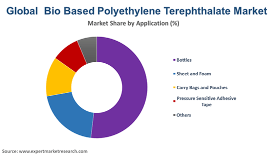 The significant applications of bio based polyethylene terephthalate include bottles, sheet and foam, carry bags and pouches, and pressure sensitive adhesive tape, among others.
