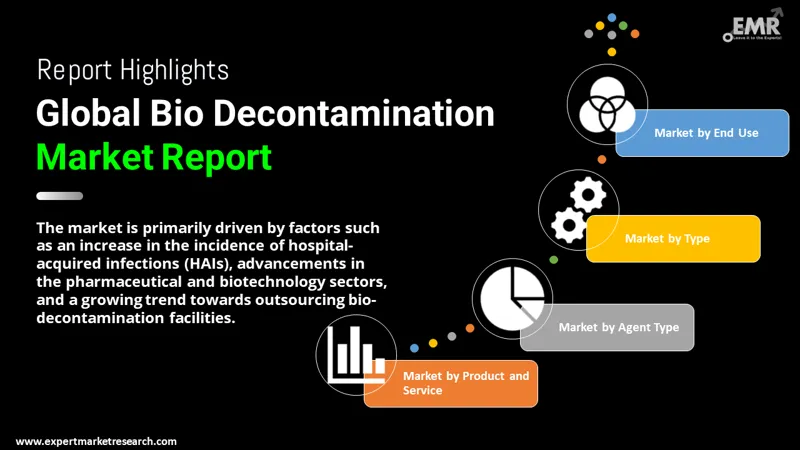 The major drivers of the global bio decontamination market are the rising incidences of hospital-acquired infections, an increasing number of surgical procedures, the growing outsourcing of bio decontamination services, the growth in the pharmaceutical and biotechnology industries, and the presence of stringent regulations. The presence of manual decontamination methods and budgetary constraints in healthcare facilities might hinder the industry growth in the coming years.