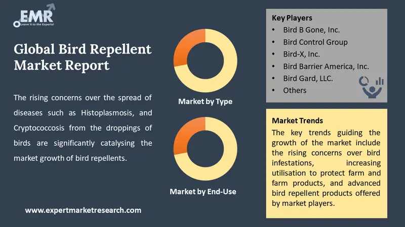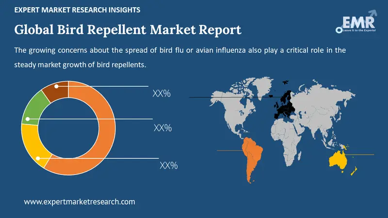 Rising concerns regarding diseases from bird droppings; the surging demand for high-quality foods; the development of non-toxic bird repellents; and the rising demand for bird repellents in buildings are favouring the global bird repellent market growth
