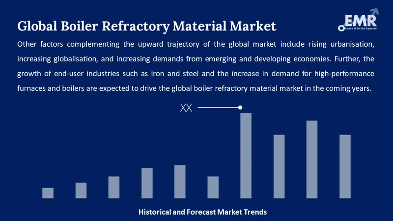 The increasing demand for electricity worldwide has triggered a high demand for new power plants. An increasing number of conventional power plants around the world are stimulating high growth in the global boiler refractory material market. Technological advancements in material sciences and chemical sciences have positively influenced the global material market in the past few years. Integration and adoption of new and emerging technologies, such as artificial intelligence (AI) and machine learning (MI), to aid in the manufacturing and distribution processes, is also anticipated to add to the market growth in the years to come. Other factors complementing the upward trajectory of the global market include rising urbanisation, increasing globalisation, and increasing demands from emerging and developing economies. Further, the growth of end-user industries such as iron and steel and the increase in demand for high-performance furnaces and boilers are expected to drive the global boiler refractory material market in the coming years.