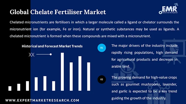 Because of the rise in population and decline in arable land, there has been an increase in demand for agricultural products. Farmers are now experimenting with new inputs to boost crop yields while also improving efficiency to satisfy the demands of an increasing population and the food processing industry. Some of the other factors driving the market growth include an increase in demand for high-value crops and the growing adoption of modern agricultural practices. The growing demand for high-value crops such as gourmet mushrooms, lavender, and garlic is driving the global chelate fertilizer industry.