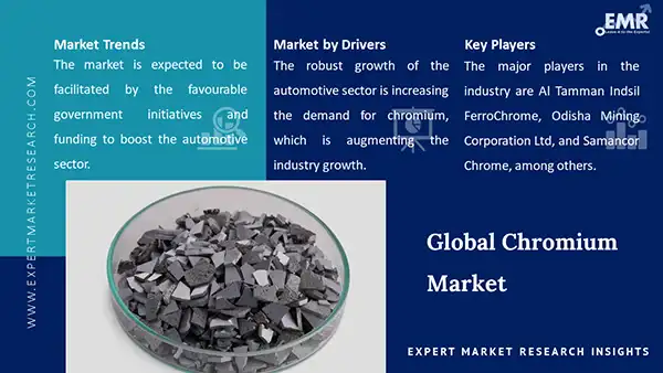 The key trends propelling the market development are the introduction of favourable government initiatives aimed at supporting the automotive sector, the growing use of chromium salts in the chemical sector, and technological advancements improving the efficiency of chromium.