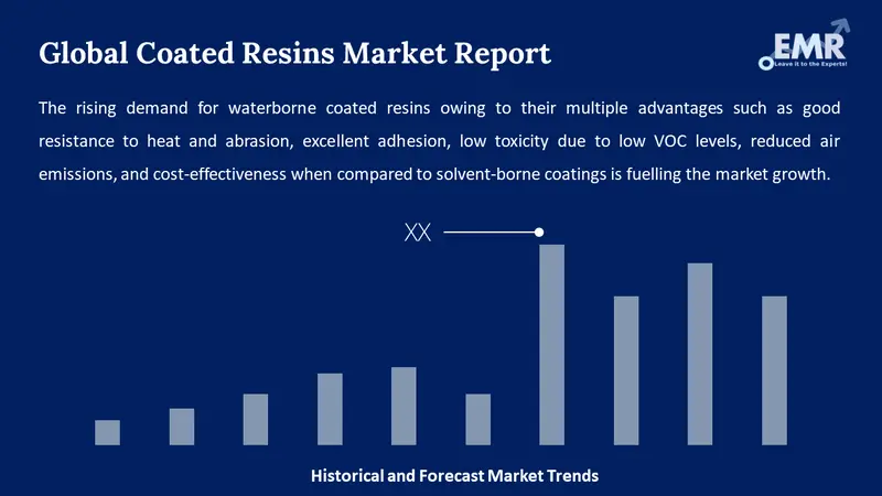 The rising demand for waterborne coated resins owing to their multiple advantages such as good resistance to heat and abrasion, excellent adhesion, low toxicity due to low VOC levels, reduced air emissions, and cost-effectiveness when compared to solvent-borne coatings is fuelling the market growth. In addition, they enhance worker safety and are used in both traditional and speciality applications. The rising production of automobiles owing to improved living standards is leading to a surge in the use of coated resins as they protect vehicle bodywork from corrosion and other damages, thus, doubling the lifetime of a vehicle. Furthermore, the initiatives taken by the government to accelerate infrastructural projects are resulting in the increased demand for coated resins in the sector. This is because coated resins, such as epoxy, are used for high-performance building applications due to their favourable properties. Additionally, the efforts made by the market players to expand their product portfolio and the advancements in coating technology are expected to augment the market for coated resins over the forecast period.